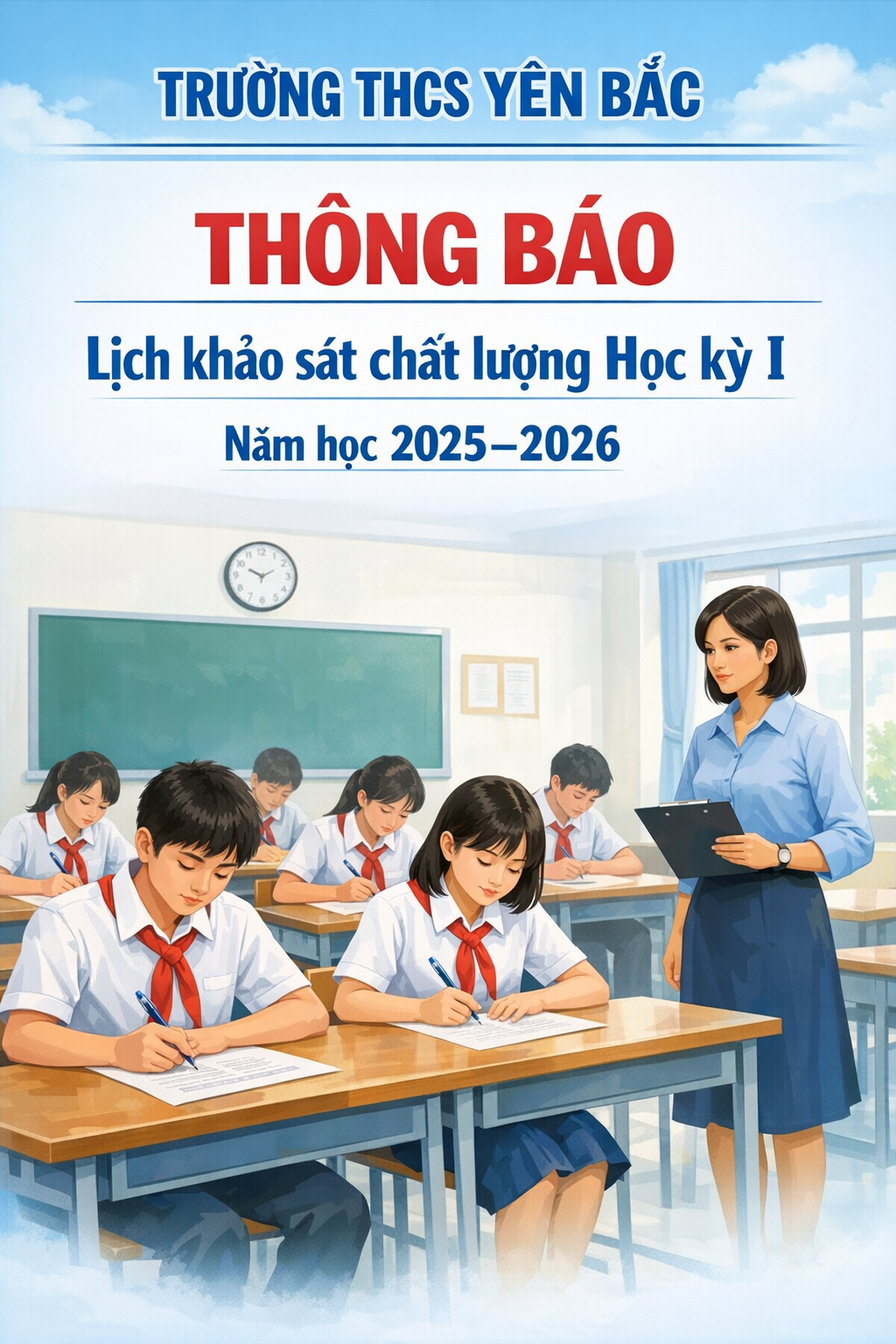 Thực hiện Kế hoạch số 110/KH-THCSYB ngày 23/10/2025 của trường THCS Yên Bắc về kế hoạch khảo sát chất lượng năm học 2025-2026. Trường THCS Yên Bắc thông báo lịch khảo sát chất lượng đại trà học kỳ I, năm học 2025-2026 cụ thể như sau: